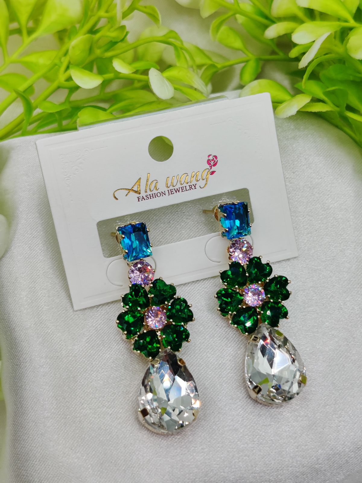 Elevate your style with these breathtaking gemstone drop earrings, a masterpiece of brilliance and charm. Featuring a captivating blend of multicolor gemstones intricately set in a delicate floral design, these earrings radiate glamour and sophistication. The shimmering teardrop-shaped crystal adds an enchanting touch, making these earrings perfect for weddings, parties, or any special occasion. Lightweight and expertly crafted, they offer a comfortable yet luxurious fit. Pair these stunning accessories with your favorite attire for a look that turns heads and exudes confidence.